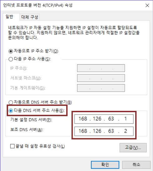 - "다음 DNS 서버 주소 사용"을 선택하고 그림과 같이 DNS 서버 주소를 입력합니다.