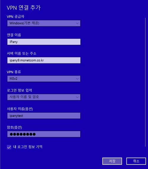 3 "VPN 연결 추가" 창이 열리면 아래와 같이 각 항목을 입력 또는 선택하고 "저장"을 클릭합니다.