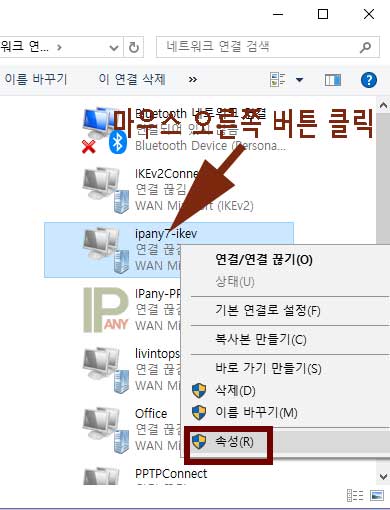 5 IPany 어댑터에 마우스를 올리고 마우스 오른쪽 버튼을 클릭하여 나타나는 메뉴 중 "속성"을 선택합니다.