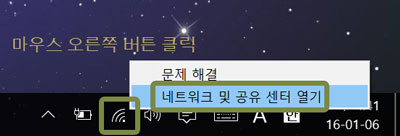 - 윈도우 데스크톱 화면의 오른쪽 아래의 네트워크 트레이 아이콘에 마우스를 올리고 마우스 오른 쪽 버튼을 클릭합니다. 네트워크 및 공유 센터 열기를 선택합니다.